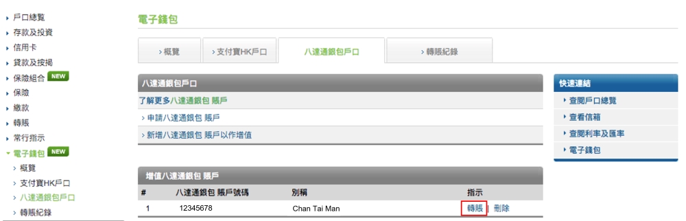 - 客戶明白對於八達通卡有限公司就八達通銀包(包括八達通手機應用程式)所提供之功能及服務,任何因使用八達通銀包所導致之損失,本行毋須負上責任。八達通銀包之申請及使用須受八達通銀包有關之條款及細則約束。詳情請瀏覽 www.octopus.com.hk。本行不會就有關八達通卡有限公司之任何改變或最新公佈通知客戶。客戶明白及接納本行並非八達通銀包之供應商。因此,有關供應商(包括其員工或代理人)就八達通銀包所提供之各方面,包括但不限於質數、供應量、八達通卡有限公司之服務說明、虛假商品說明、不實的陳述、誤導、遺漏、未獲授權的陳述、不良營商手法或誘導,本行毋須負上任何責任。